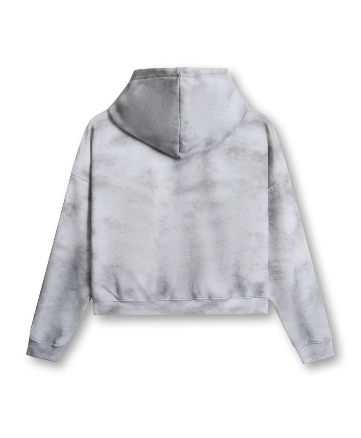 Elaborada en un suave color gris claro con un efecto de lavado o tie-dye sutil, que le da un toque vintage desgastado. La cremallera frontal añade versatilidad, permitiendo llevarla abierta o cerrada para diferentes looks. Los detalles vibrantes de la gráfica contrastan con el fondo neutro, haciendo que el diseño “DOBLE CRAZY” destaque con energía.